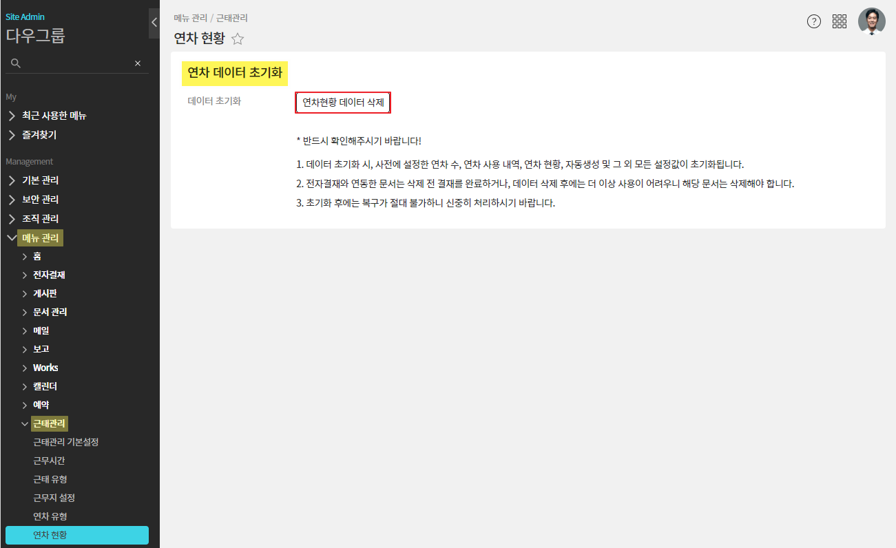 - 관리자페이지(SiteAdmin) ▶ 메뉴관리 ▶ 근태관리 ▶ 연차 현황 ▶ 연차현황 데이터 삭제