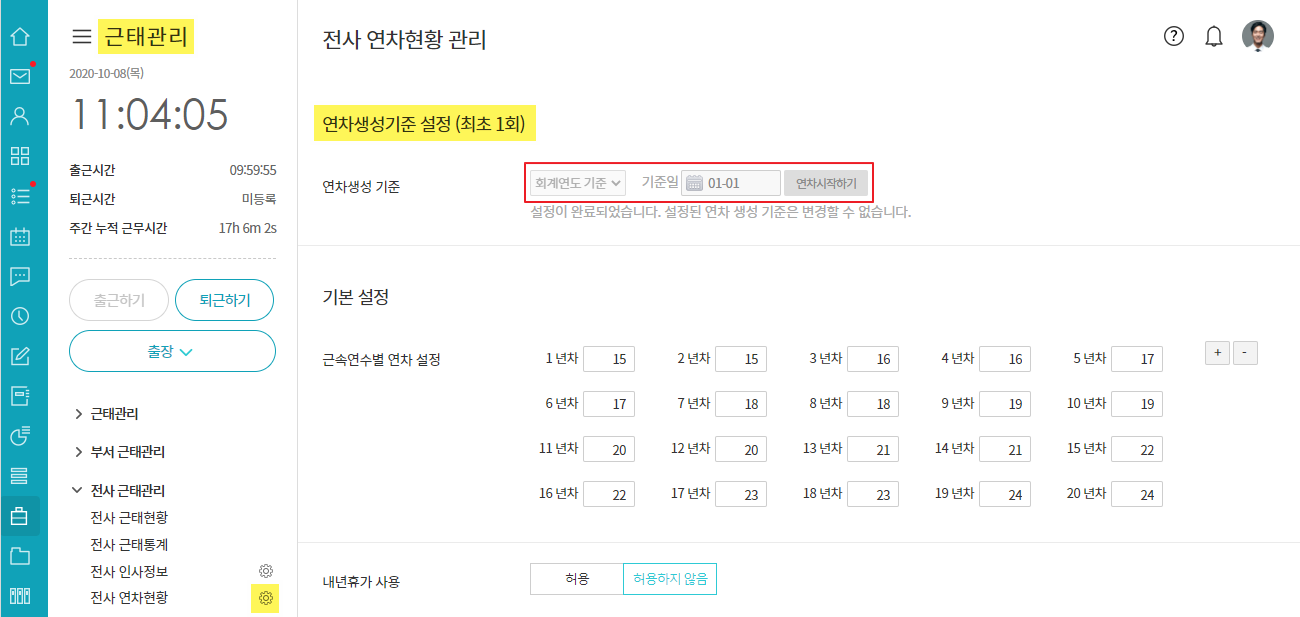 - 연차생성 기준은 1회 연차 시작하기를 클릭하면 기준을 변경할 수 없습니다.