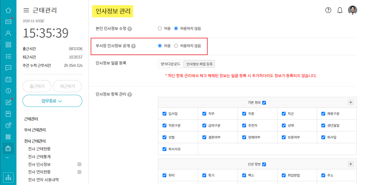 인사정보 운영자가 부서 인사정보 공개 설정시 부서장이 부서원이 인사정보 확인이 가능합니다.