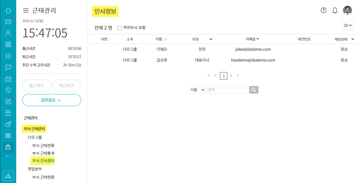 근태관리 ▶ 부서 근태관리 ▶ 부서 인사정보 ▷ 부서원 인사정보 확인