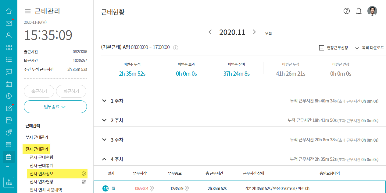 ① 근태관리 ▶ 전사 근태관리 ▶ 전사 인사정보 옆 톱니바퀴