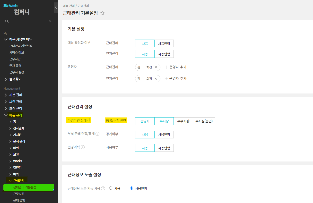 기본 설정은 근태관리 운영자만 수정할 수 있도록 설정되어 있습니다.