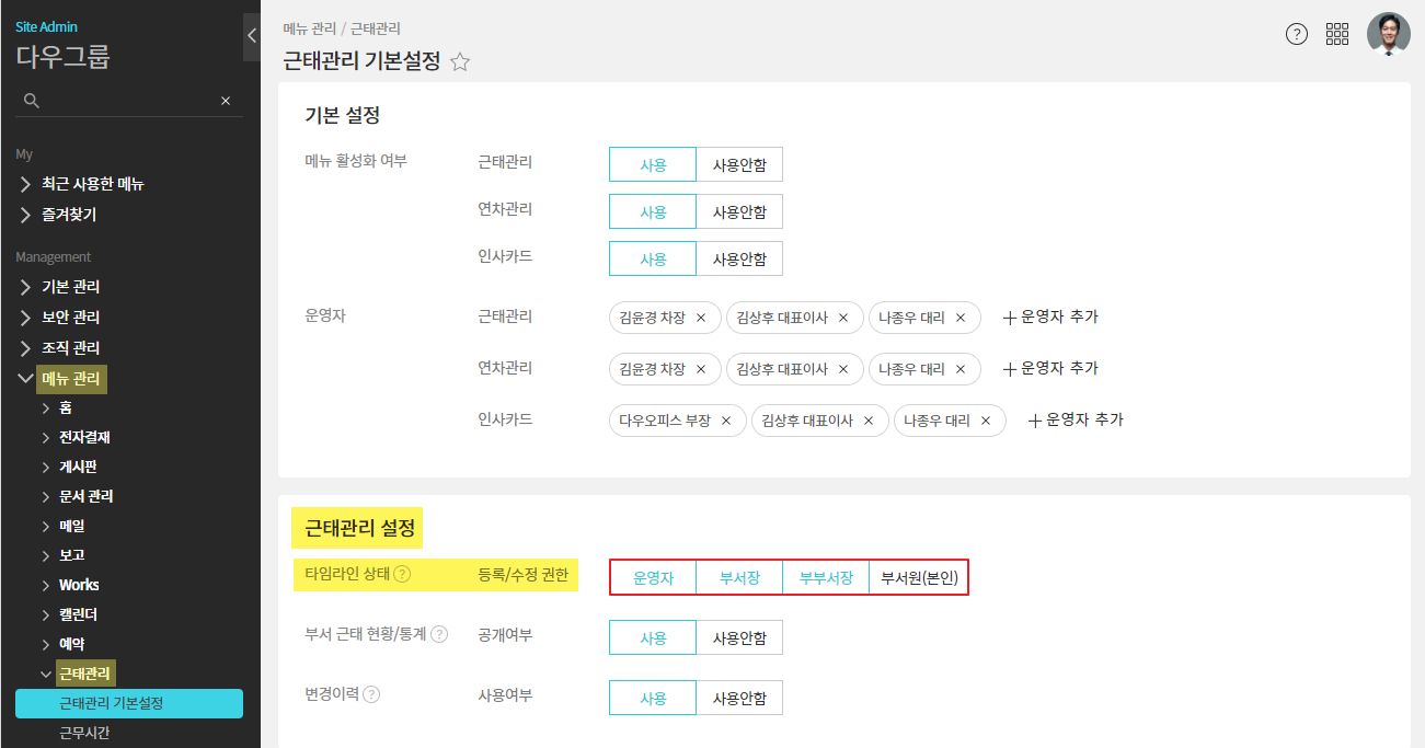 근태관리 설정 ▷ 타임라인 상태 ▷ 등록/수정 권한 ▷ 권한자 활성화 ▷ 저장