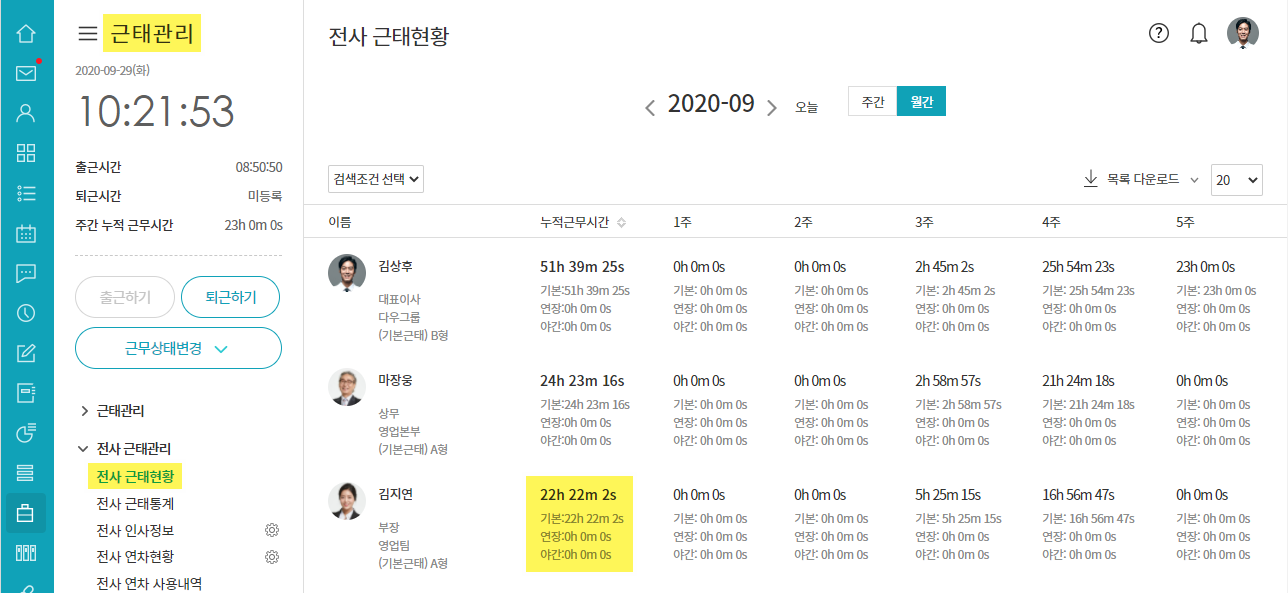 ①근태관리 ▶ 전사 근태현황 ▶ 사용자 근무시간 클릭