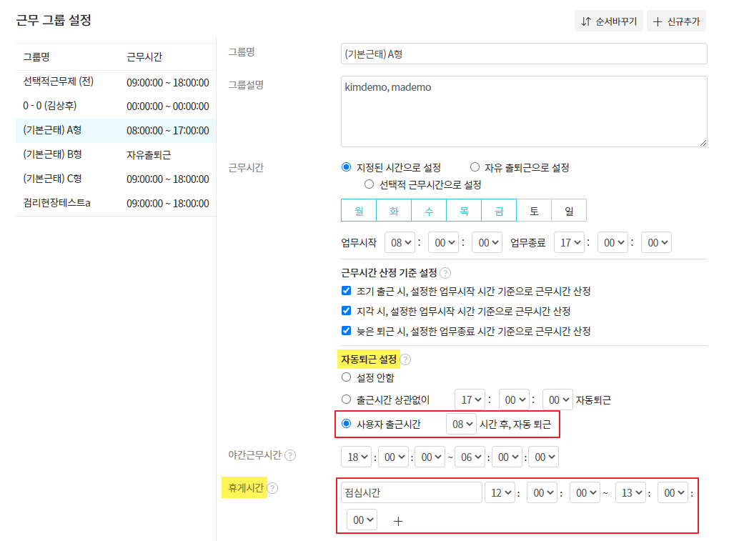 [사용자 출근시간 n시간 후, 자동 퇴근] 설정 시 휴게시간(점심시간)을 포함하여 체크됩니다.
