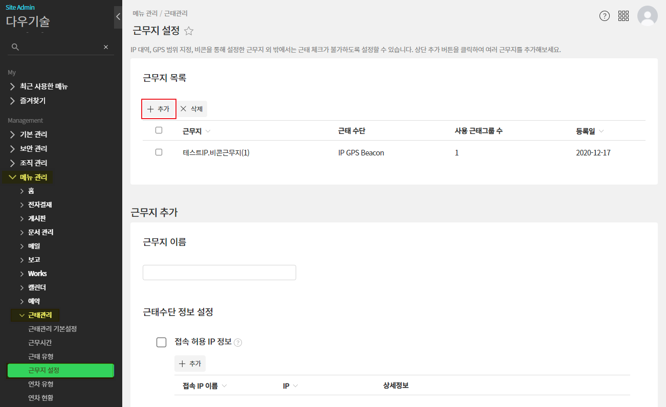 ① 관리자페이지(SiteAdmin) ▶ 매뉴 관리 ▶ 근태관리 ▶ 근무지 설정 ▷ 근무지 목록 ▷ 추가