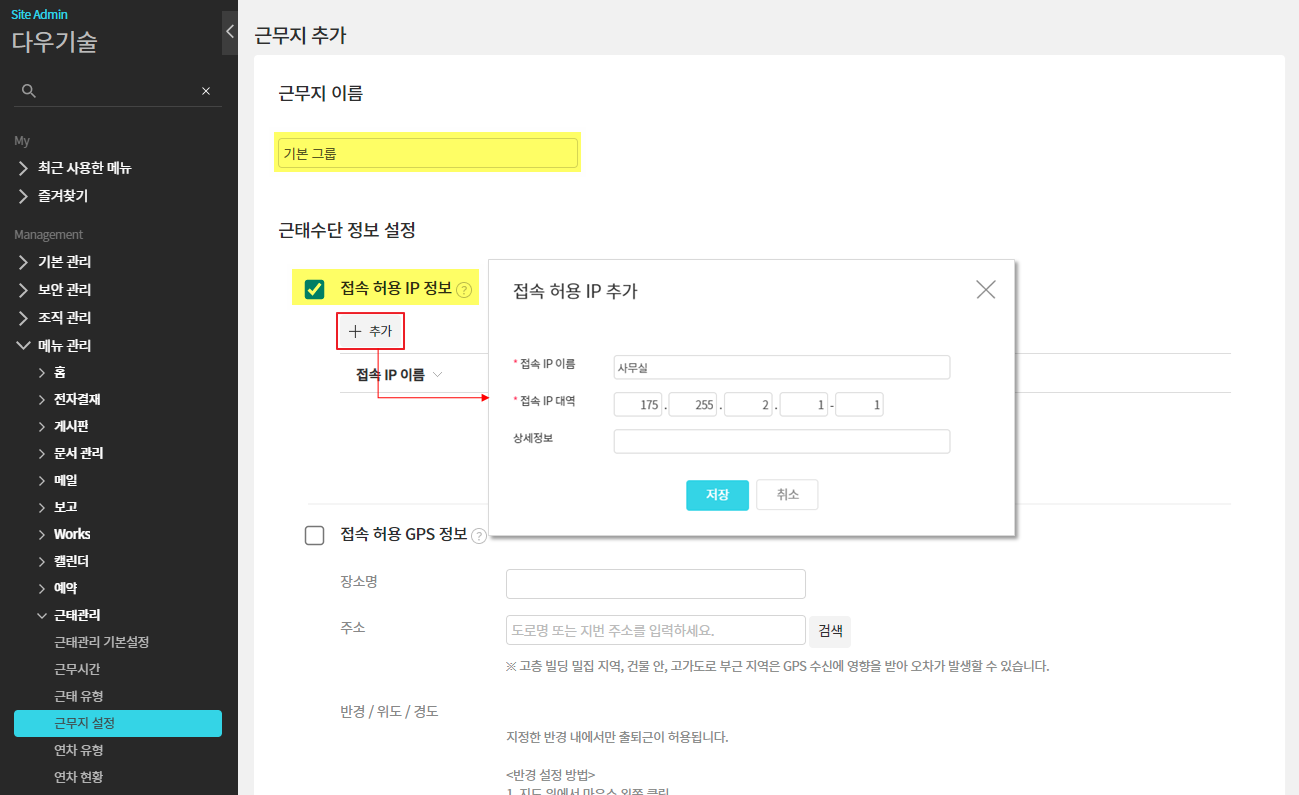 ② 근무지 이름 입력 ▷ 접속 허용 IP 정보 '체크' ▷ 추가 ▷ 정보 입력 ▷ 저장 ▷ 하단의 '저장' 클릭