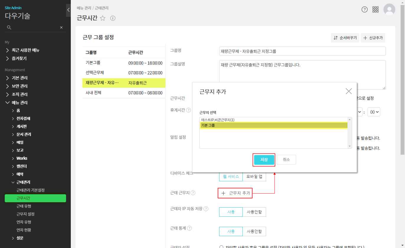 ③ 근태관리 ▶ 근무시간 ▶ 근무 그룹 선택 ▷ 근태 근무지 ▷ + 근무지 추가 ▷ 근무지 선택 ▷ 저장 ▷ 하단의 [저장] 클릭