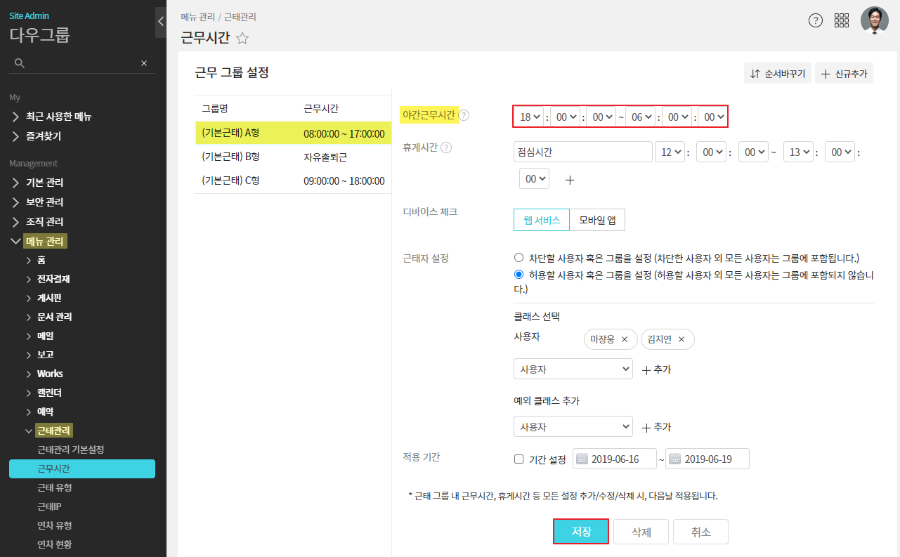 관리자가 야간근무시간을 설정할 수 있습니다.