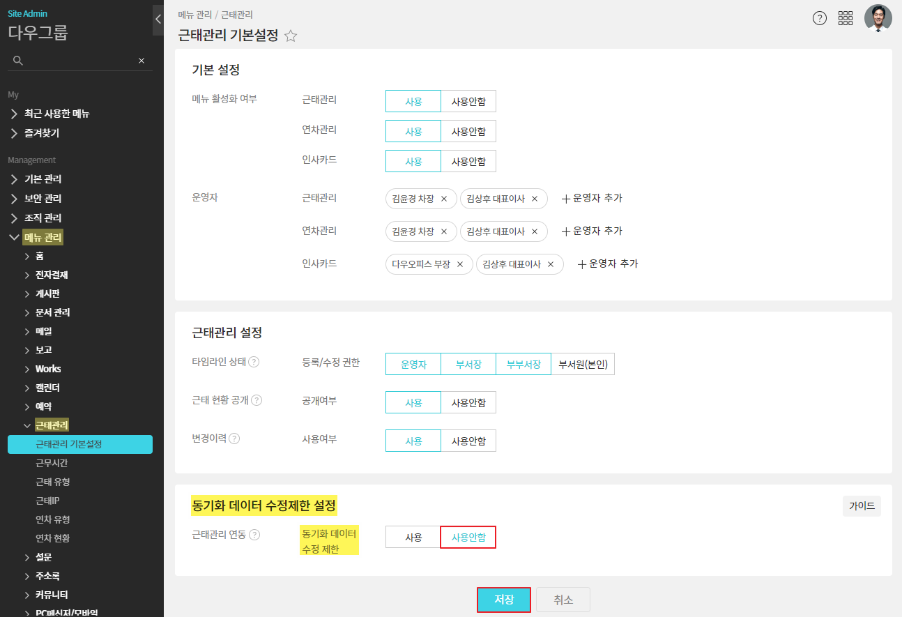 동기화 데이터 수정제한 설정 ▷ 동기화 데이터 수정 제한 ▷ 사용안함 ▷ 저장