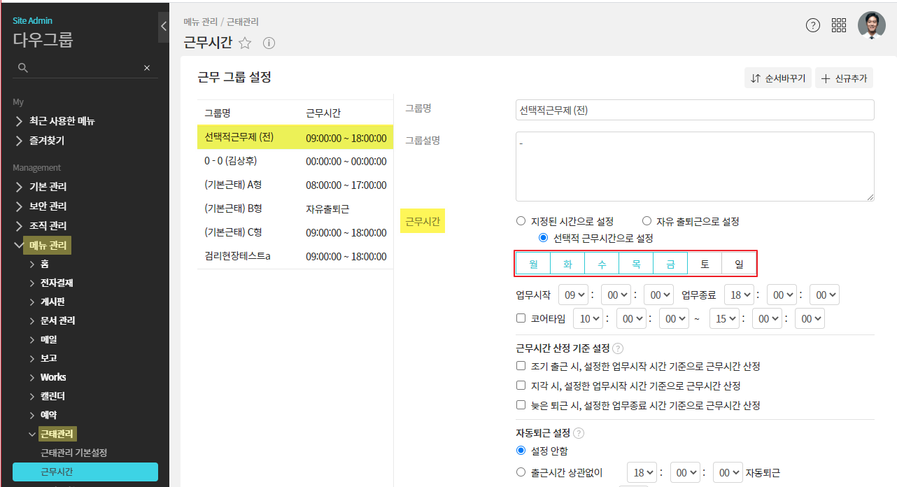 - 관리자페이지(SiteAdmin) ▶ 메뉴 관리 ▶ 근태관리 ▶ 근무시간 ▶ 근무그룹 선택 ▷ 근무시간의 근무요일 확인
