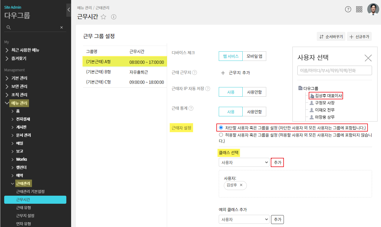 근무그룹 선택 ▷ 근태자 설정 ▷ 차단할 사용자 선택 ▷ 클래스 선택