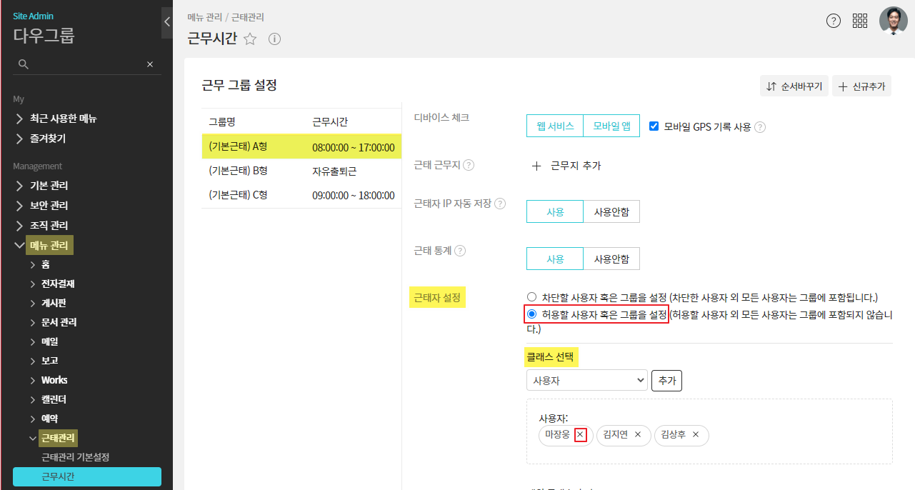 근무그룹 선택 ▷ 근태자 설정 ▷ 허용할 사용자 선택 ▷ 클래스 선택