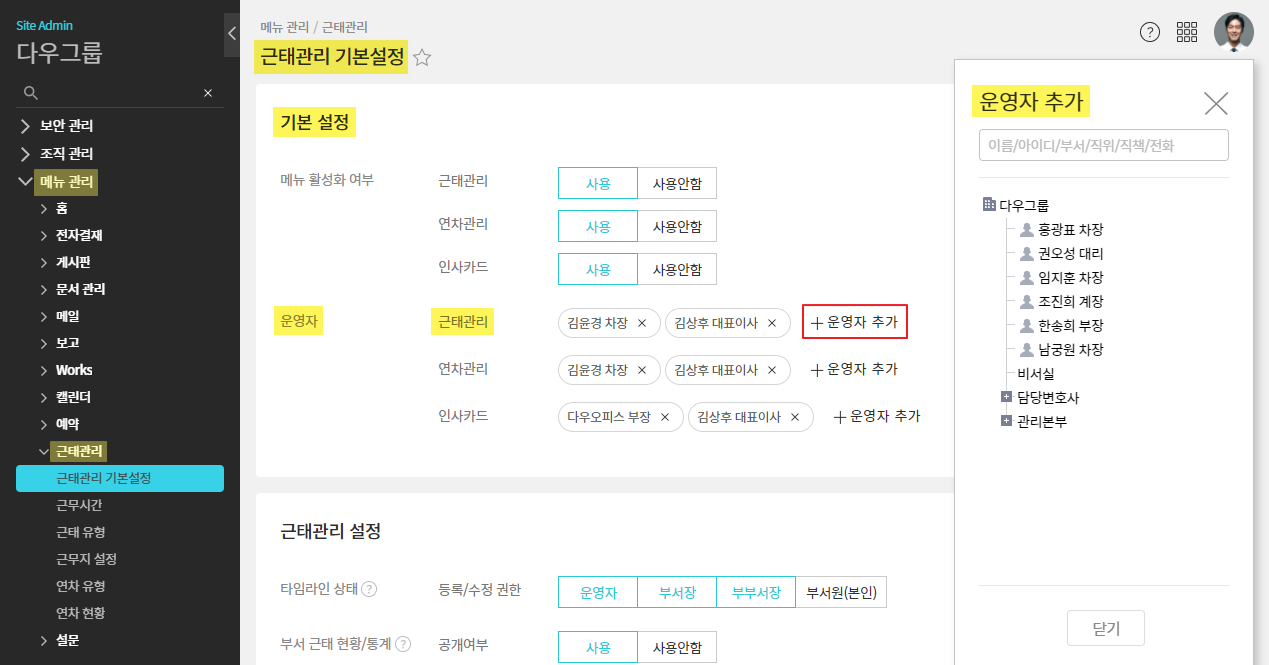 관리자 권한으로 근태관리 운영자를 지정할 수 있습니다.