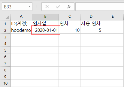초기설정 파일 등록 시 입사일을 yyyy-mm-dd 형식으로 업로드 하여야 합니다.