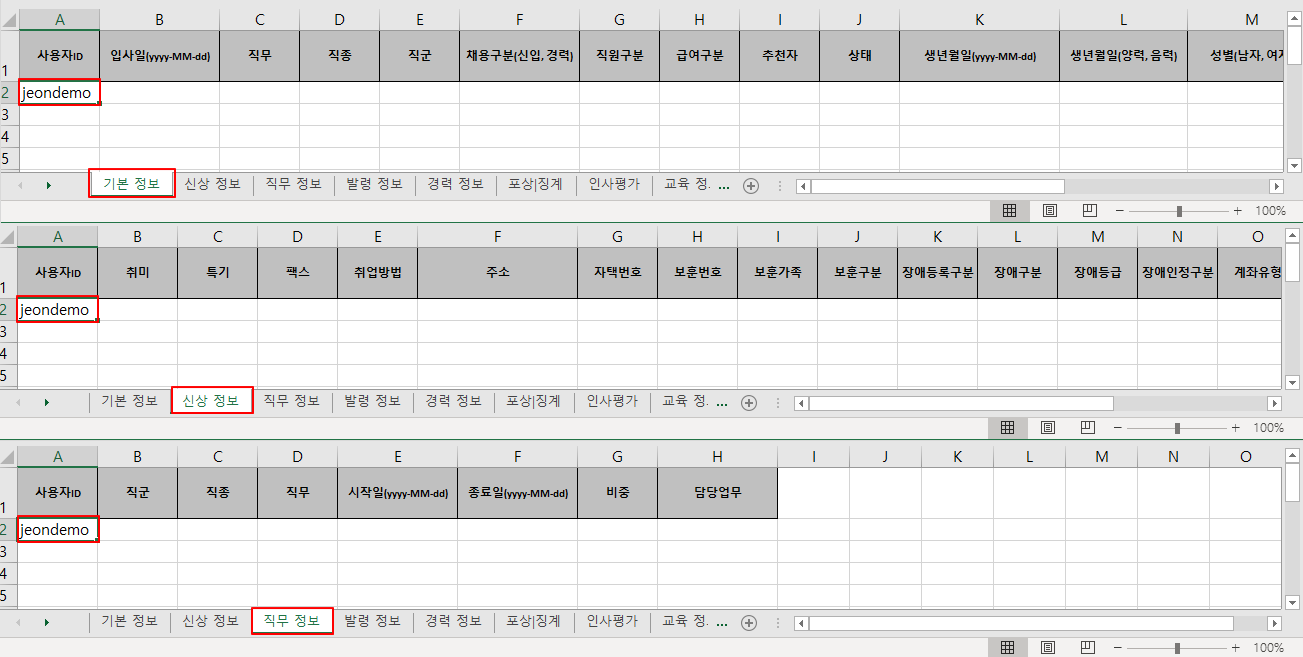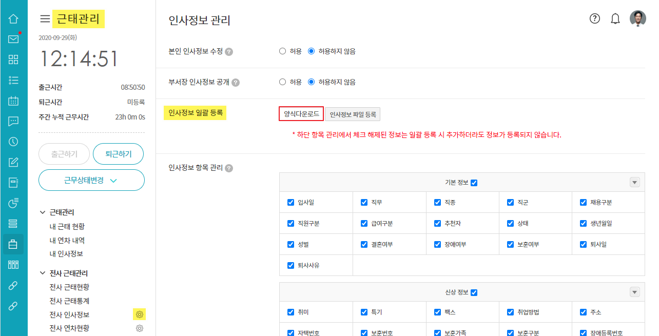 ① 근태관리 ▶ 전사 인사정보 옆 톱니바퀴 ▶ 인사정보 일괄 등록 ▷ 양식다운로드