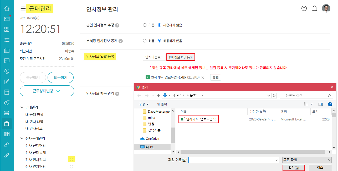 ③ 근태관리 ▶ 전사 인사정보 옆 톱니바퀴 ▶ 인사정보 일괄 등록 ▷ 인사정보 파일 등록 ▷