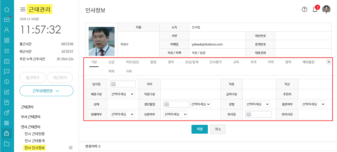 - 근태관리 ▶ 전사 인사정보 ▶ 사용자 클릭 ▷ 인사정보 수정 ▷ 저장