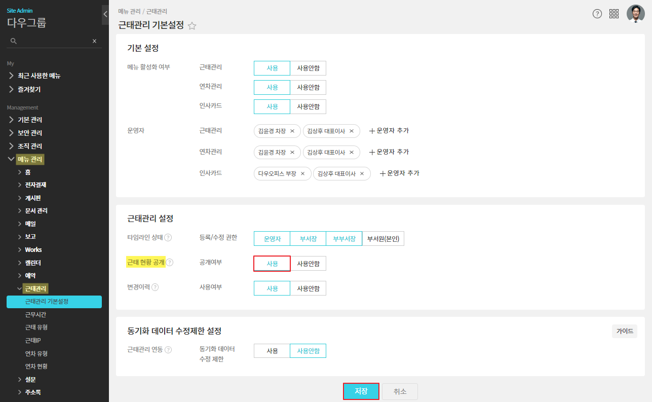 - 관리자페이지(SiteAdmin) ▶ 메뉴 관리 ▶ 근태관리 ▶ 근태관리 기본설정 ▶ 근태 현황 공개 ▷ 사용 ▷ 저장