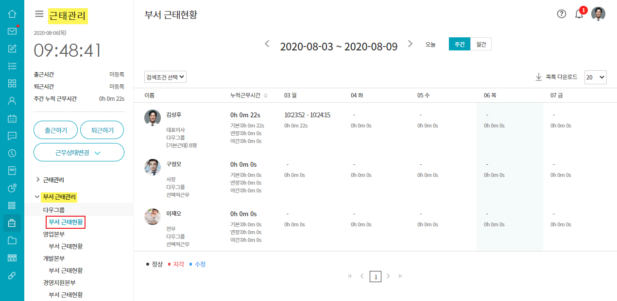 - 상위부서의 부서장/부부서장은 하위부서의 근태현황을 확인할 수 있습니다.