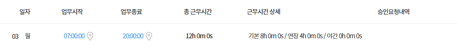 - 연장 근무시간 : 총 근무시간 중 기본과 야간을 제외하고 근로한 시간