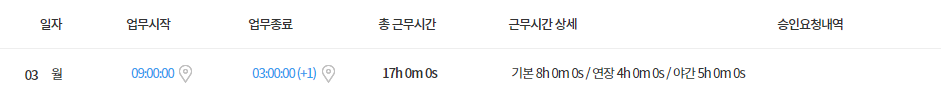 - 야간 근무시간 : 관리자가 설정한 야간 근무 시간대에 근로한 시간