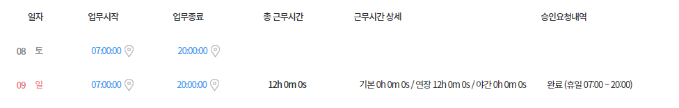 - 휴일 근무로 근무시간이 산정 되지 않습니다.