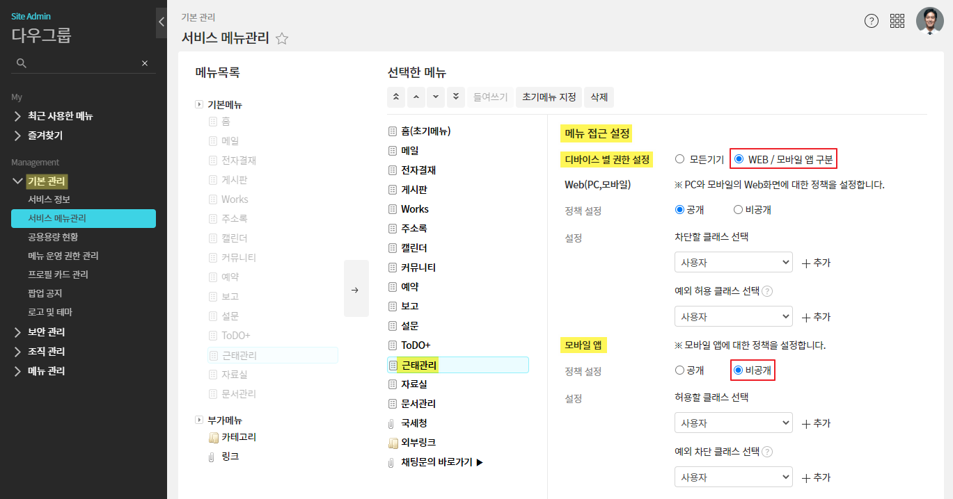 - 관리자 권한으로 모바일 앱에서 메뉴를 비공개 설정 후 [허용할 클래스]로 사용자를 추가하면
