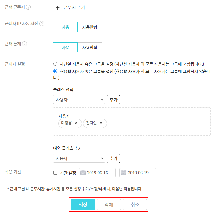 근무그룹은 최소 1개 이상 존재하여야 하기 때문에, 기본 근무그룹은 삭제할 수 없습니다.