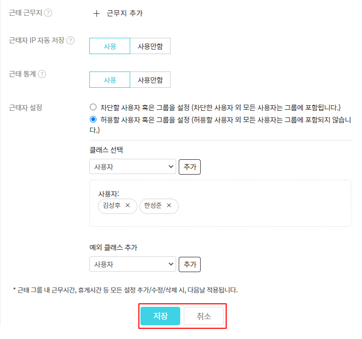 | 기본(Default) 근무그룹 | 추가한 근무그룹 | |