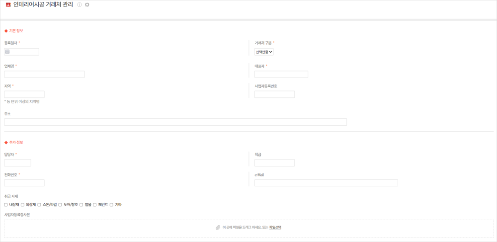 인테리어시공 자재를 공급하는 거래처를 등록 관리하는 앱입니다. 자재 발주와 품목 관리 앱 개발 시 이 앱과의 연동을 통해 거래처 정보를 보다 효과적으로 관리할 수 있습니다.