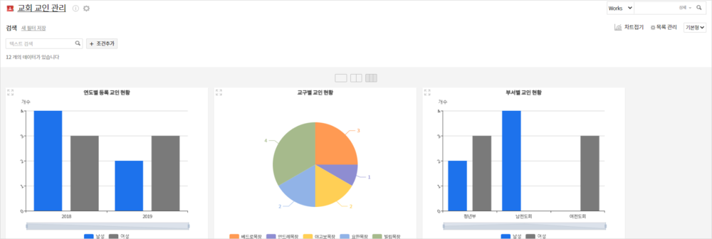 - 연도별 등록 교인 현황, 교구별 교인 현황, 부서별 교인 현황에 대해 한눈에 확인할 수 있습니다.