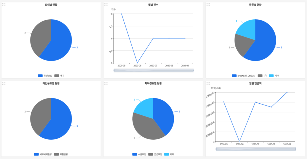 - 상태별, 월별 건수, 종류별 현황, 매입용도별 현황, 획득경위별 현황, 월별 입금액에 대한 정보를 한눈에 확인할 수 있고, 상태정의를 통해 상태별로 목록을 확인할 수 있습니다.