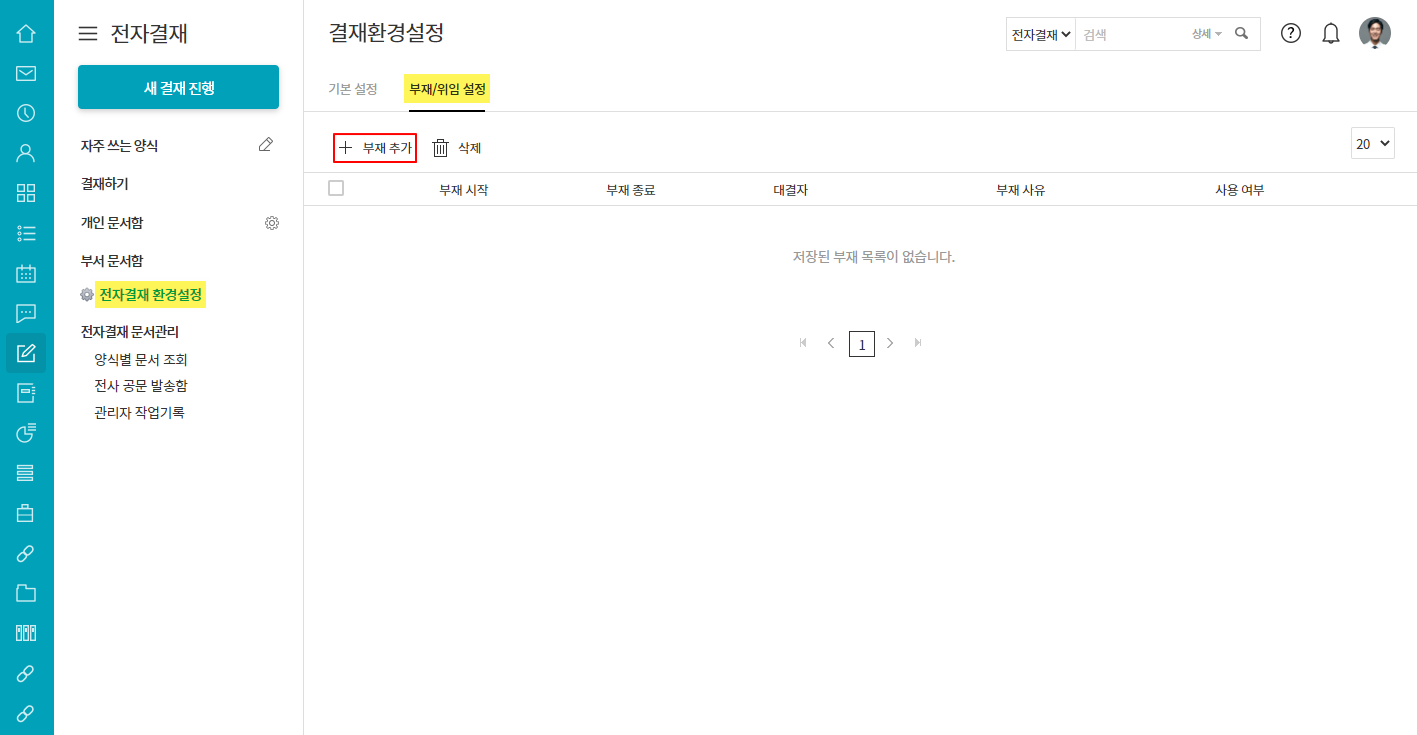 ① 전자결재 ▶ 전자결재 환경설정 ▶ 부재/위임 설정 ▷ + 부재 추가