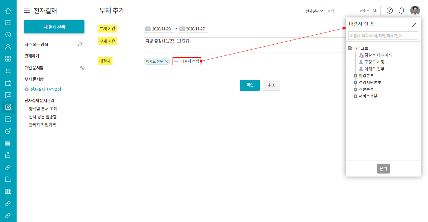 <전자결재 : 부재/위임 설정 방법>