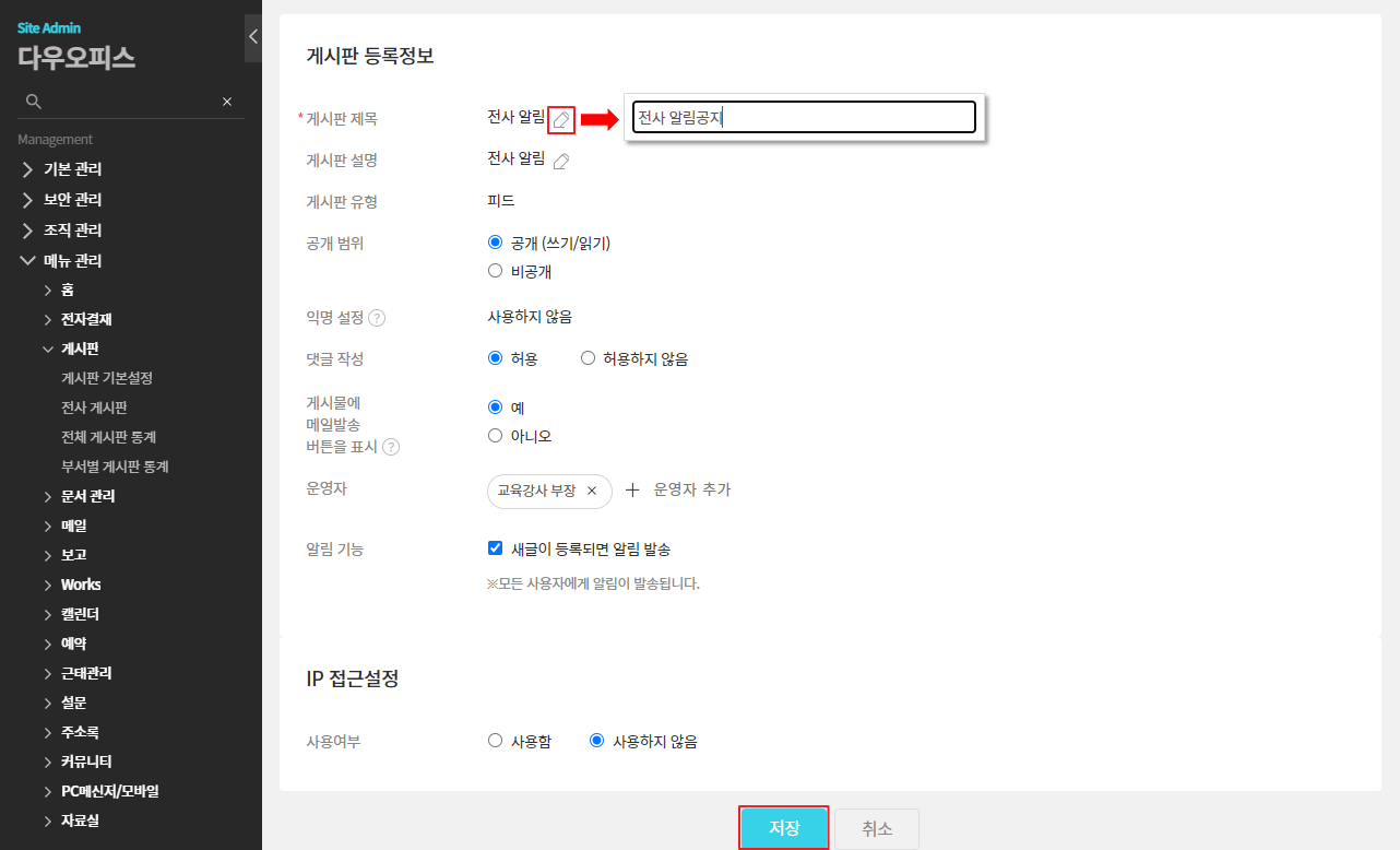 ② 게시판 이름 우측 수정 버튼 클릭 ▷ 이름 변경 ▷ 저장