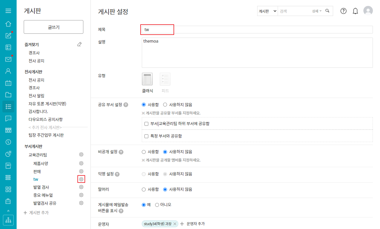 - 변경하려는 게시판 이름 우측의 설정(톱니바퀴) 버튼 클릭 ▷ 제목 변경 ▷ 저장