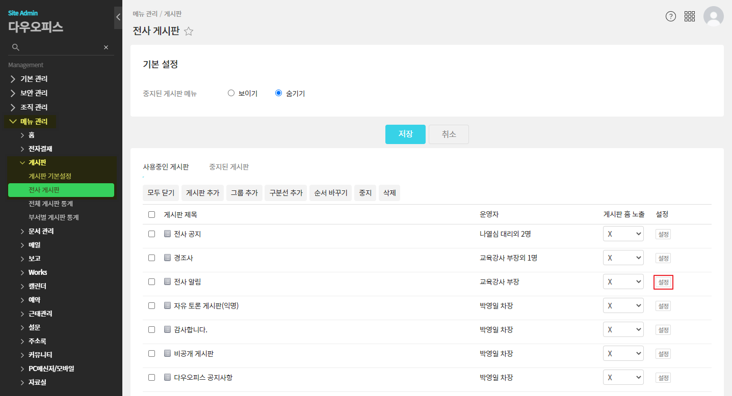① 관리자페이지 ▶ 메뉴 관리 ▶ 게시판 ▶ 전사 게시판 ▷ 변경하려는 게시판의 [설정] 버튼 클릭