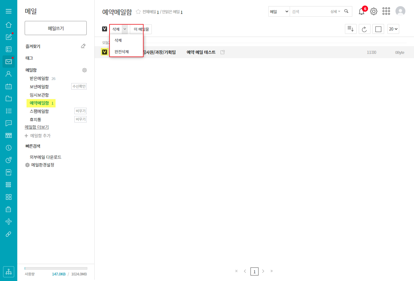 - 예약메일함 ▶ 메일 선택 ▷ 삭제 클릭 (우측의 ∨ 버튼 클릭해 "완전삭제" 가능)