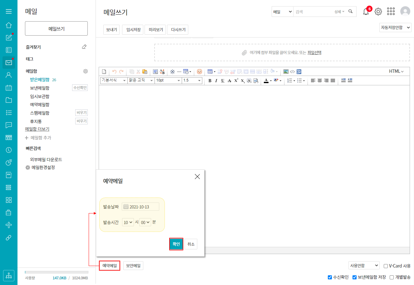 ※ 예약메일 설정 후에는 시간 및 내용을 변경할 수 없으며, 예약메일함에서 예약한 메일을 삭제 후 다시 작성하시기 바랍니다.