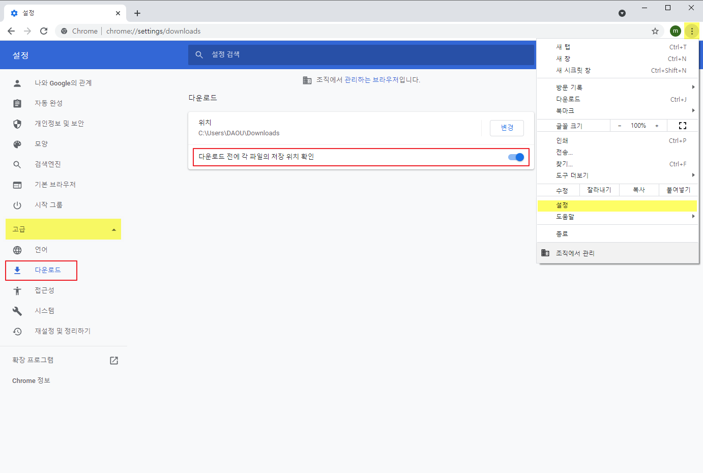 - 우측 상단 [ ⋮ ] 버튼 클릭 ▶ 설정 ▶ 고급 ▷ 다운로드 ▷ [다운로드 전에 각 파일의 저장 위치 확인] 버튼 활성화