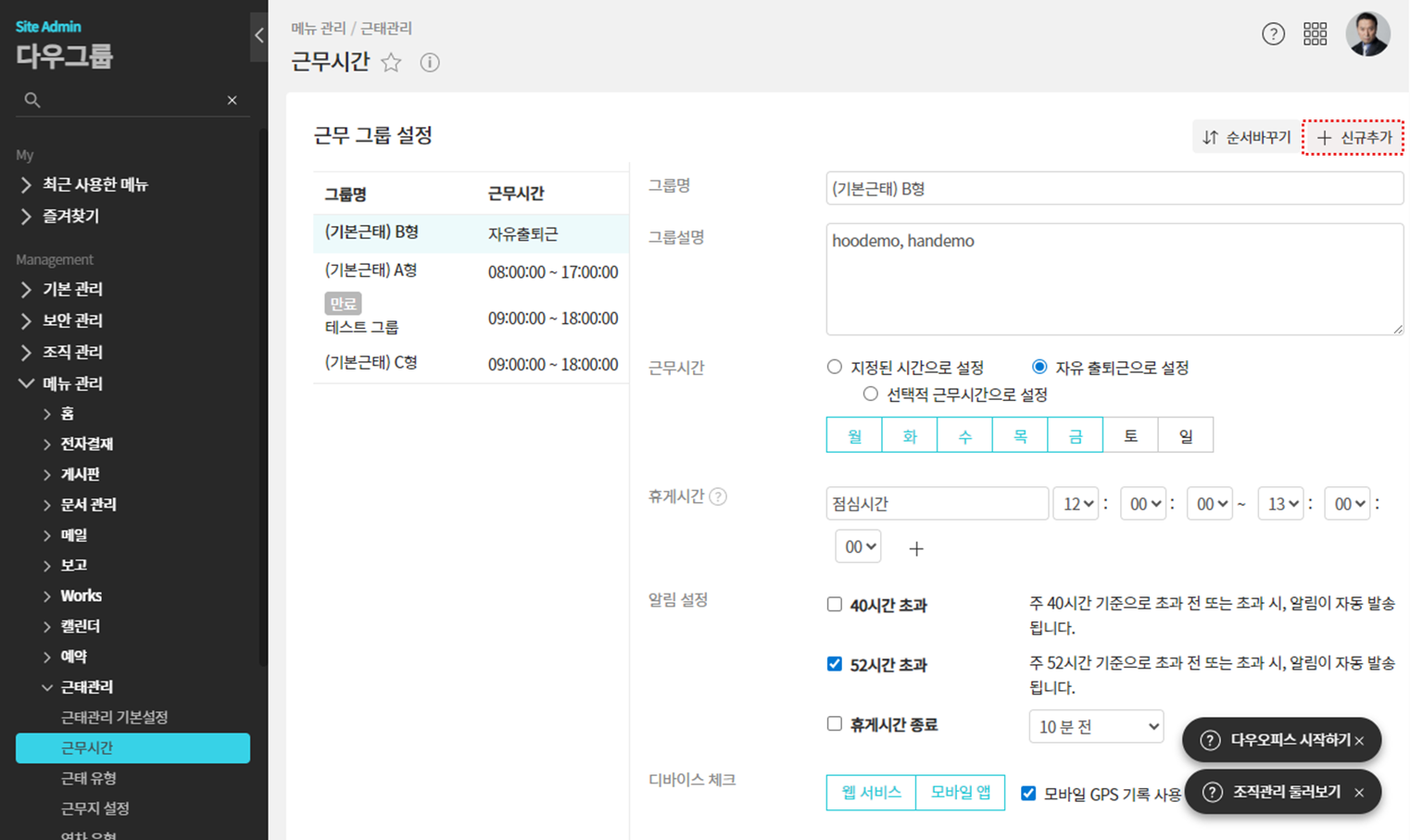- 관리자페이지(SiteAdmin) > [근태관리] > [근무시간] > [+ 신규추가] 클릭