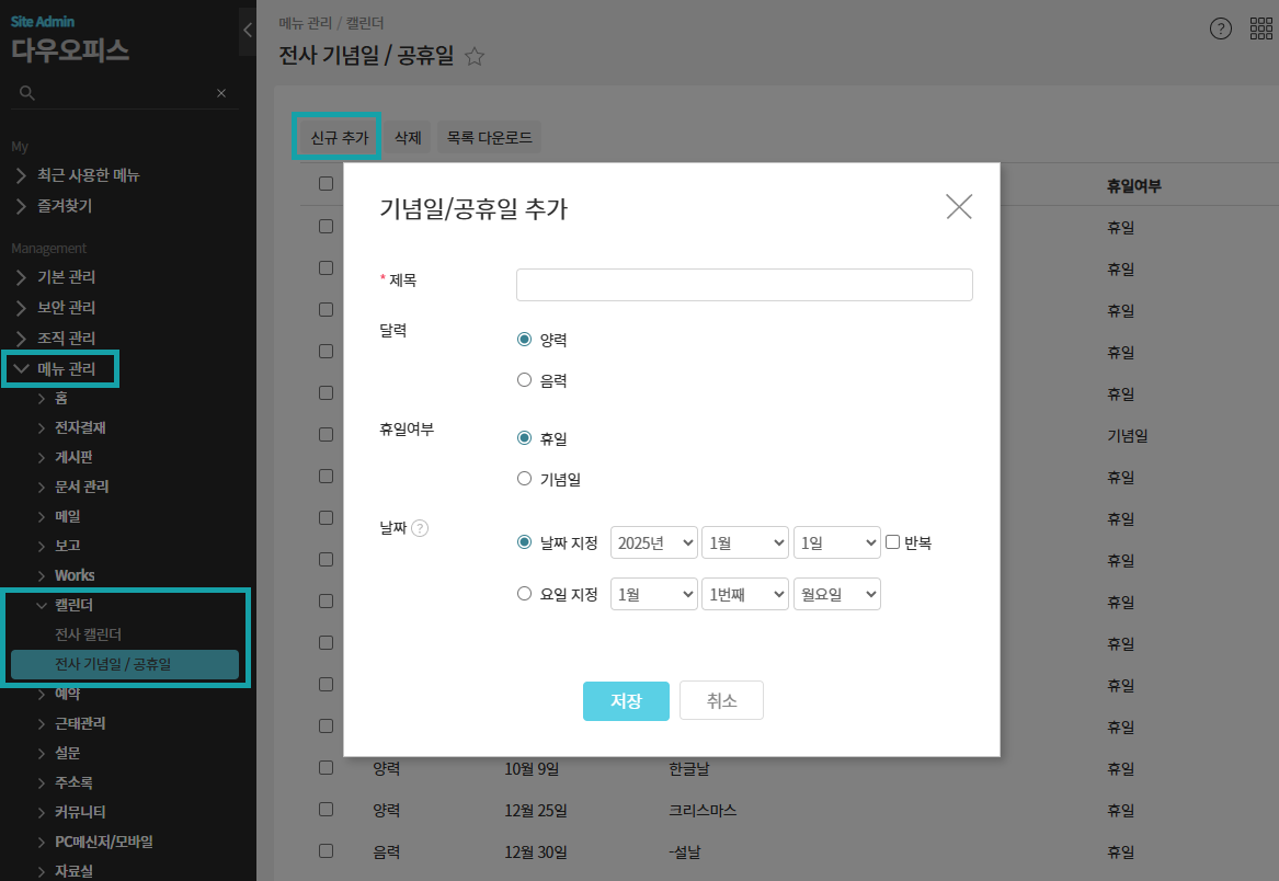 - 관리자페이지(SiteAdmin) > [메뉴 관리] 클릭 > [캘린더] 클릭 > [전사 기념일/공휴일] 클릭 > [신규 추가] 클릭 > 기념일/공휴일 추가 > 종류,날짜,휴일 선택 > 제목 입력 > [저장] 클릭