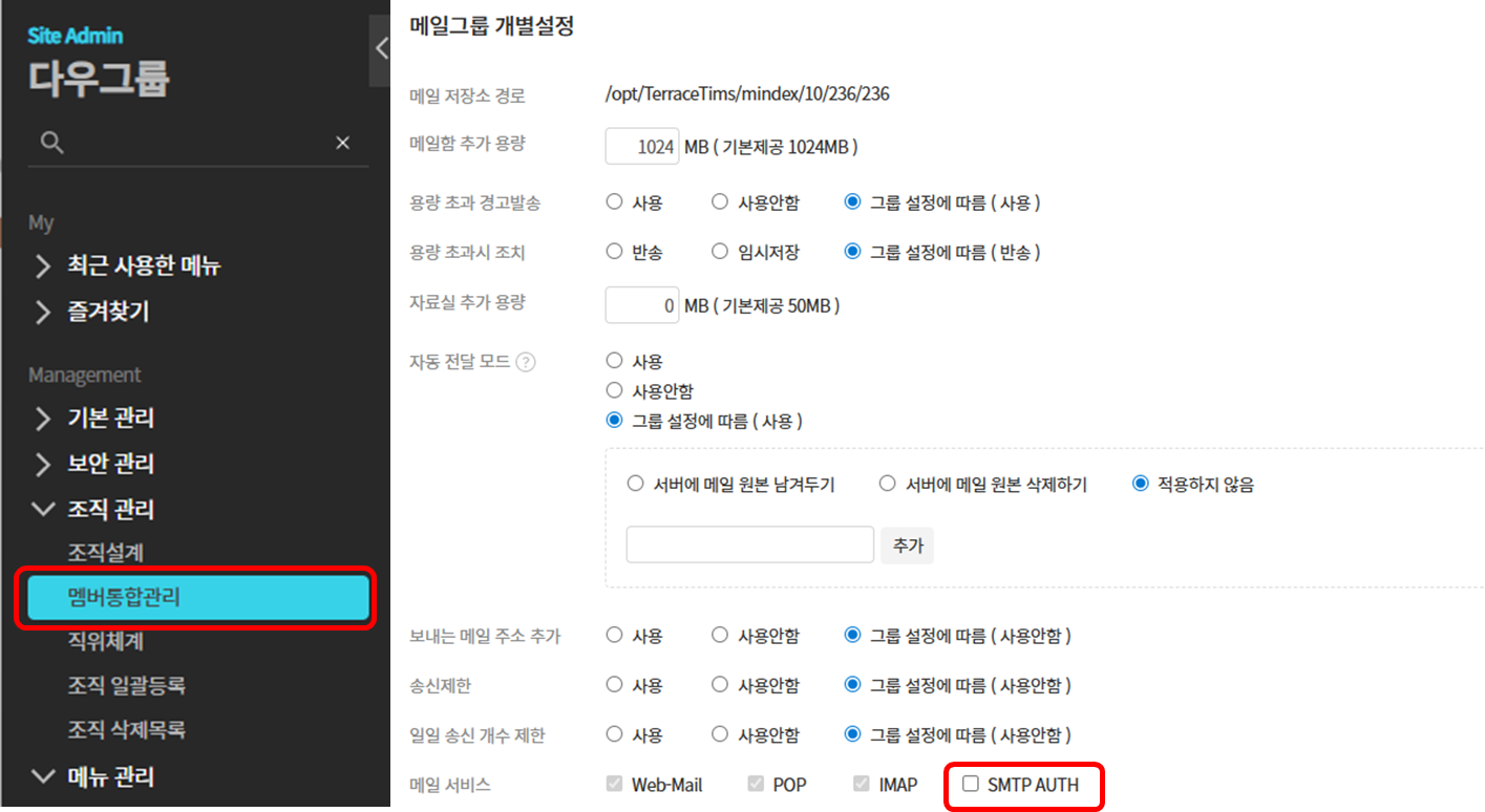 2. SMTP AUTH(외부 메일 발송 기능) 재활성화