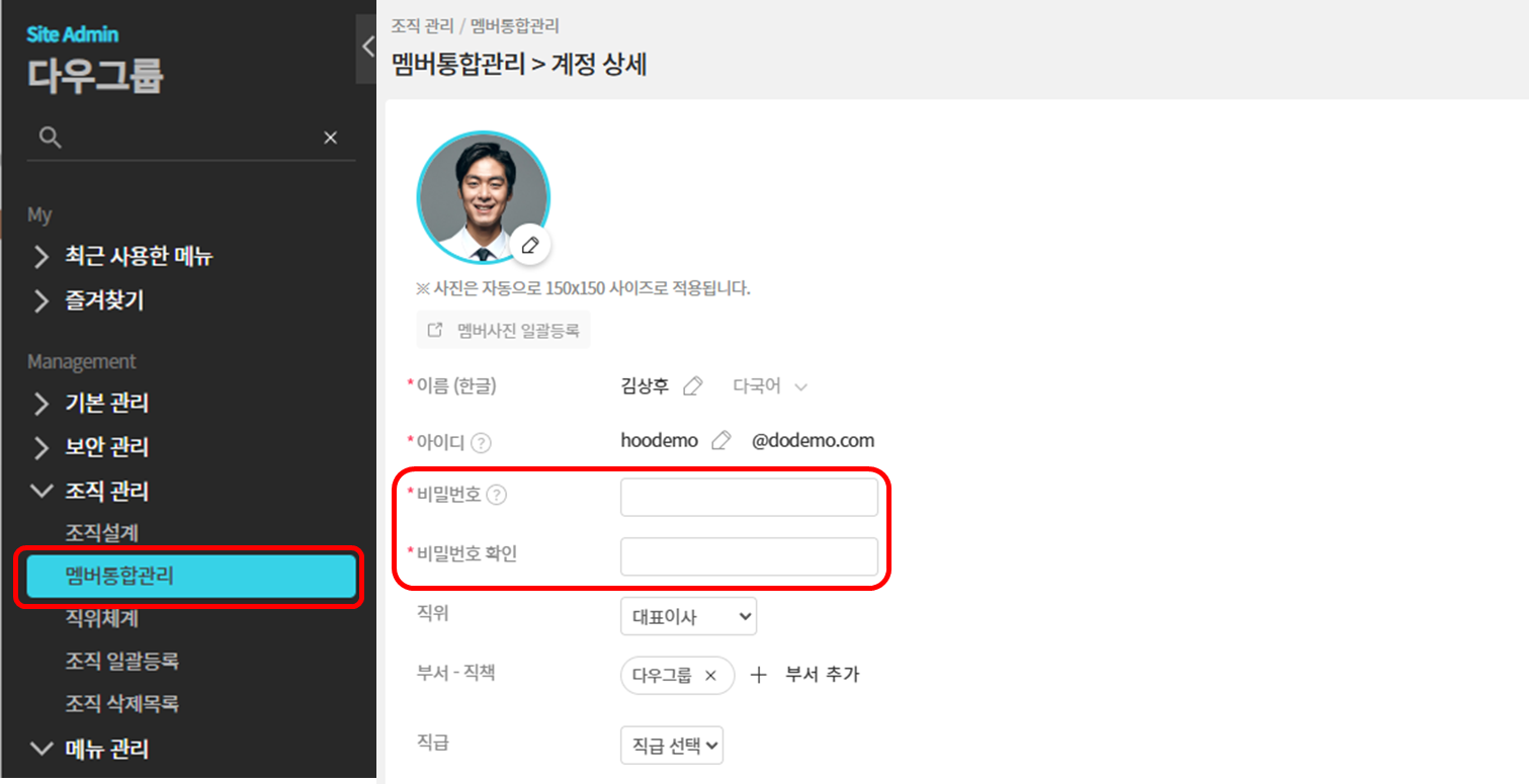 - 사이트 관리자 > 조직관리 > [멤버통합관리] 클릭