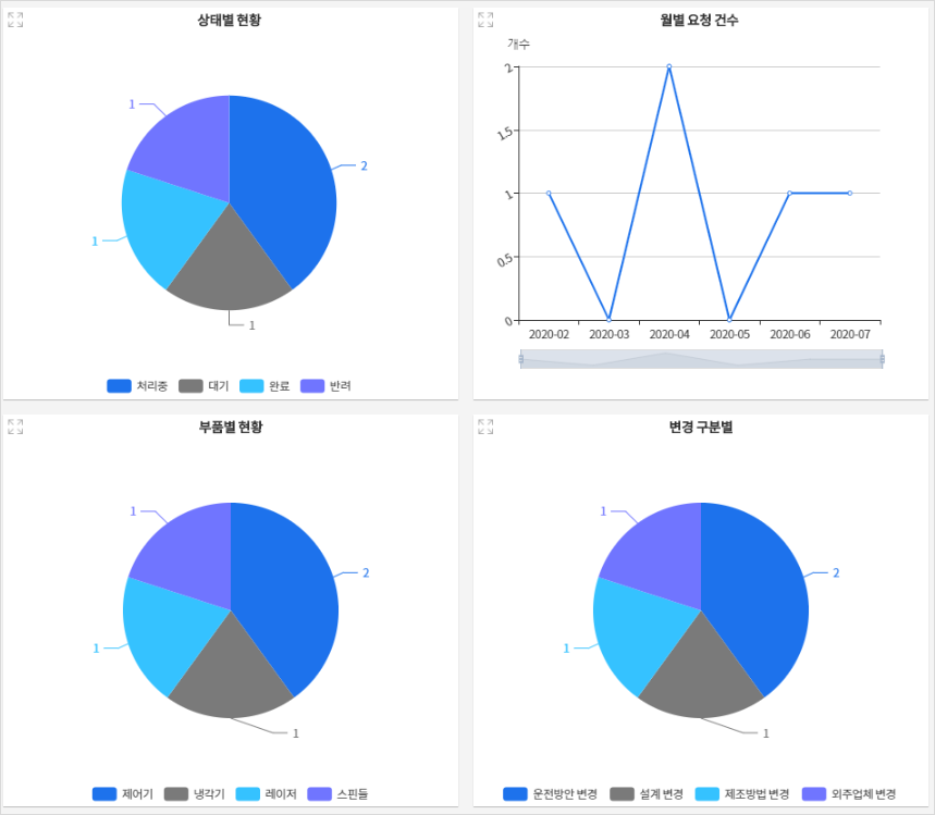 - 상태별, 월별 요청 건수, 부품별 현황, 변경 구분별에 대한 현황을 그래프로 확인할 수 있고, 프로세스를 통해 실시간으로 상태 변화를 확인할 수 있습니다.
