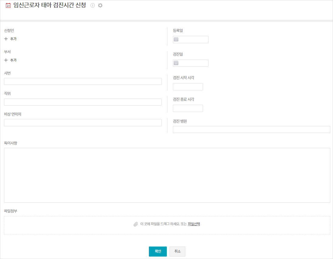 하단의 "임신근로자 태아 검진시간 신청 .dwt" 파일을 다운로드 받아서 앱을 수동으로 등록하여 주시기 바랍니다.