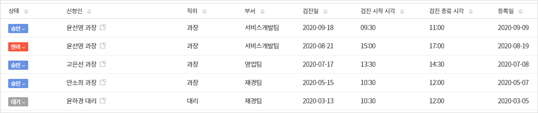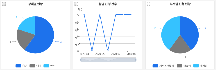- 상태별, 월별 신청 건수, 부서별 신청 현황에 대한 그래프를 확인할 수 있고, 프로세스를 통해 실시간으로 상태 변화를 확인할 수 있습니다.