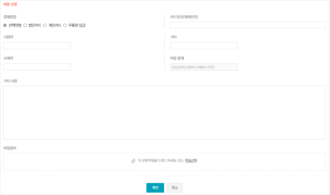 - 조직도에서 신청자를 직접 선택할 수 있고, 응시 내역, 비용 신청에 대해 적을 수 있습니다.