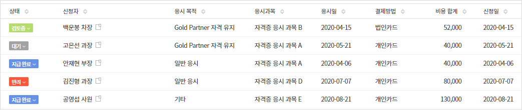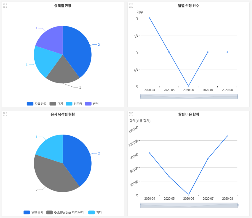 - 상태별, 월별 응시 목적별 현황, 월별 비용 합계에 대한 현황을 그래프로 확인할 수 있고, 프로세스를 통해 실시간으로 상태 변화를 확인할 수 있습니다.